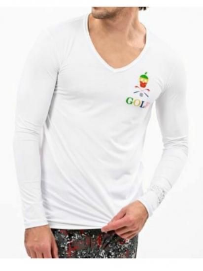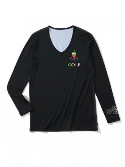 左胸にマルチカラーのリーフスカルとGOLFロゴプリント、左袖にスカルがデザインされた腕時計モチーフのプリントを施しました。