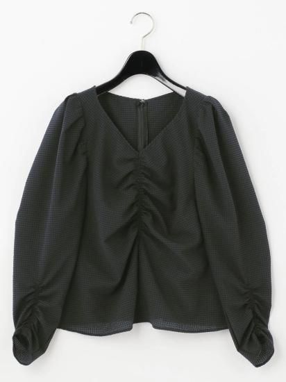 胸元と袖にシャーリングを入れて、すっきりとしたネックラインで仕上げた、フェミニンな美シルエットが魅力です。
