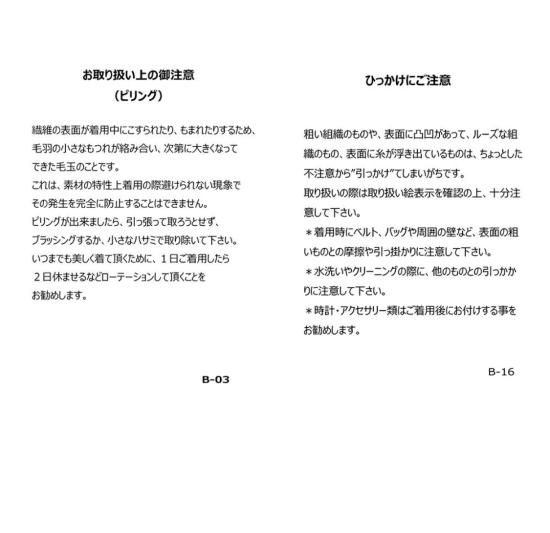 ピリングができましたら、引っ張って取ろうとせず、ブラッシングするか、小さなハサミで取り除いてください。 いつまでも美しく着ていただくために、1日ご着用したら2日休ませるなどローテーションしていただくことをおすすめします。