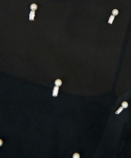 二重仕立てにしたチュールに飾ったキラキラと煌めくビジューが、装いをフェミニンに印象付けます。