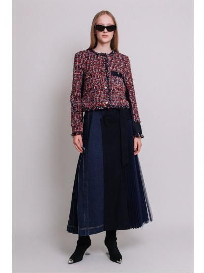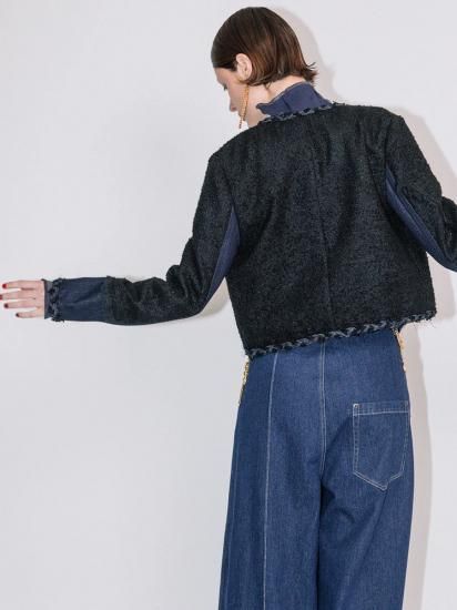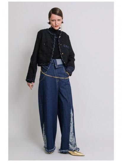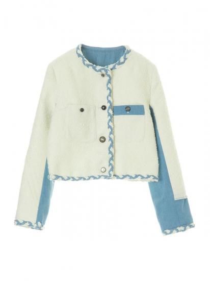 ツイード切り替えには、さり気なくフリンジを挟み、襟ぐり、前端から裾と袖口は、デニムとツイードコードの三つ編みトリミングを施し、細部にまで拘ったデザイン。