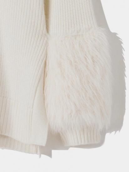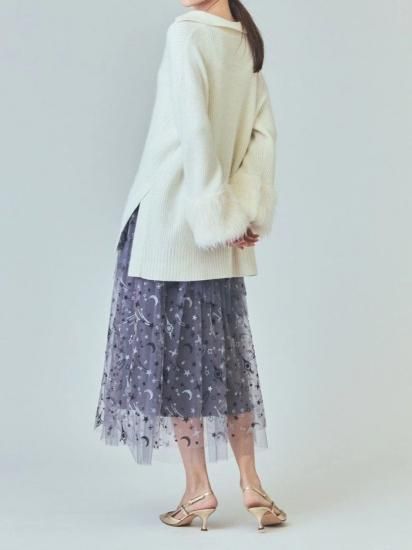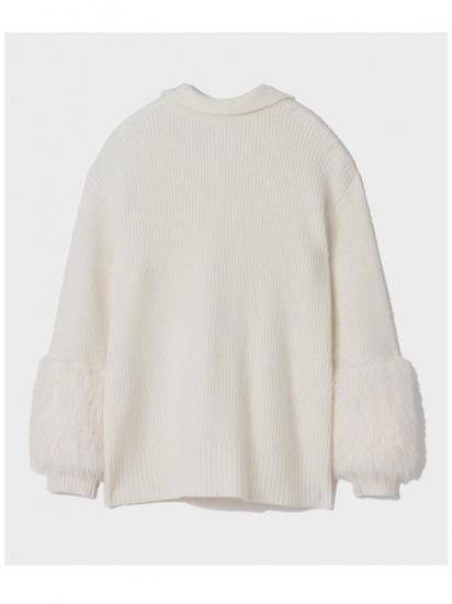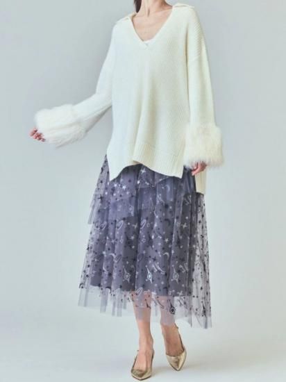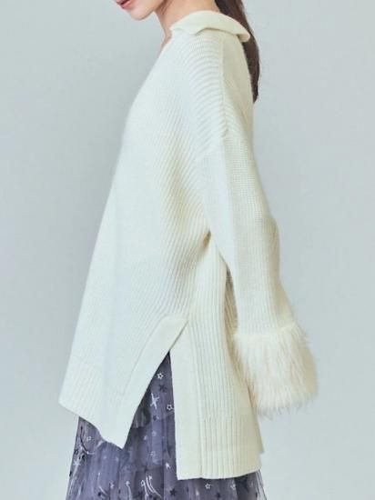 袖口に毛足の長いフェザーヤーンを編み込んだボリュームスリーブが魅力の一枚。
