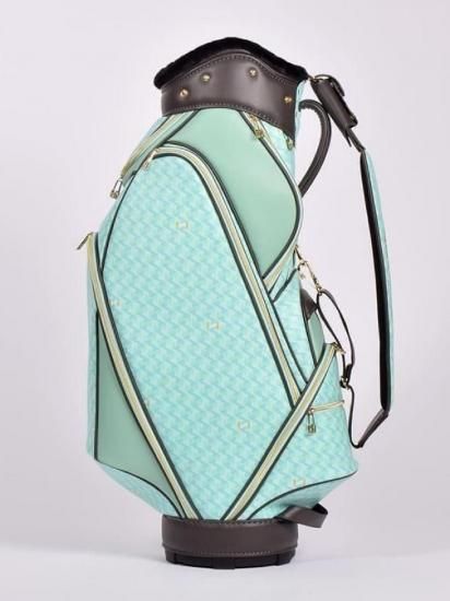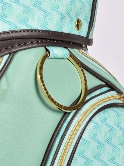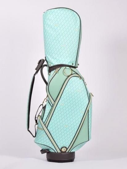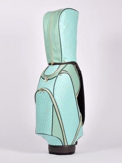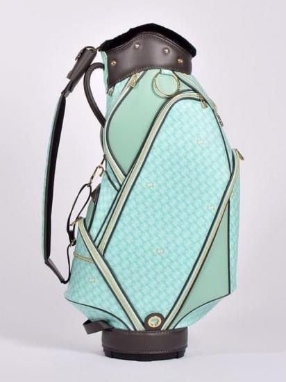 中心にはブランドロゴをあしらい全体的に角を出したデザインの金属パーツが加わることで、キャディバッグの雰囲気がグッと引き締まり、一気に高級感がアップ致しました。